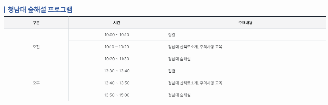 청남대 숲해설 프로그램은 연중 매일 2회 진행하며, 상태 탐방 체험, 숲해설, 산림치유 등을 진행하며, 관심이 있으신 분은 홈페이지를 통해서 예약접수 할 수 있습니다.